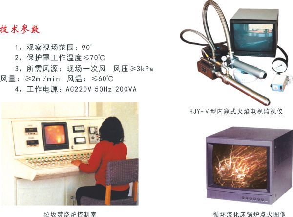 HJY-Ⅳ型內窺式火焰電視監(jiān)視儀是用于監(jiān)測爐內照度較低的循環(huán)流化床鍋爐及垃圾焚燒爐爐內物料狀態(tài)的彩色工業(yè)電視系統(tǒng),該產品是我公司技術人員與光學研究所部分科技人員專門針對循環(huán)流化床鍋爐和垃圾焚燒爐而共同開發(fā)研制的,只要光照度大于10LUX的環(huán)境條件即能清晰成像,在國內處于領先地位。對于循環(huán)流化床鍋爐,因為爐內為密封狀態(tài),在點火及投料過程中極易造成高溫或低溫結焦,而爐內照度又很低,用國內現(xiàn)有的爐膛火焰監(jiān)視裝置看不到爐內物料狀態(tài)。如采用HJY-Ⅳ型產品可看到爐內物料狀態(tài)并指導投料并及時發(fā)現(xiàn)結焦趨勢,從而避免結焦或投料過多造成點火過程中滅火。而垃圾焚燒爐,由于污染問題,爐體為密封式,投料后極易將火壓滅,即使在燃燒時,爐內照度也非常低,通常在300LUX以下,而國內常規(guī)產品需在500LUX照度下才能工作。所以只有采用HJY-Ⅳ型產品,才能指導投料及探針插孔并在遠離現(xiàn)場的操作室內清晰看到爐內的垃圾焚燒狀態(tài),從而實現(xiàn)安全經濟運行。